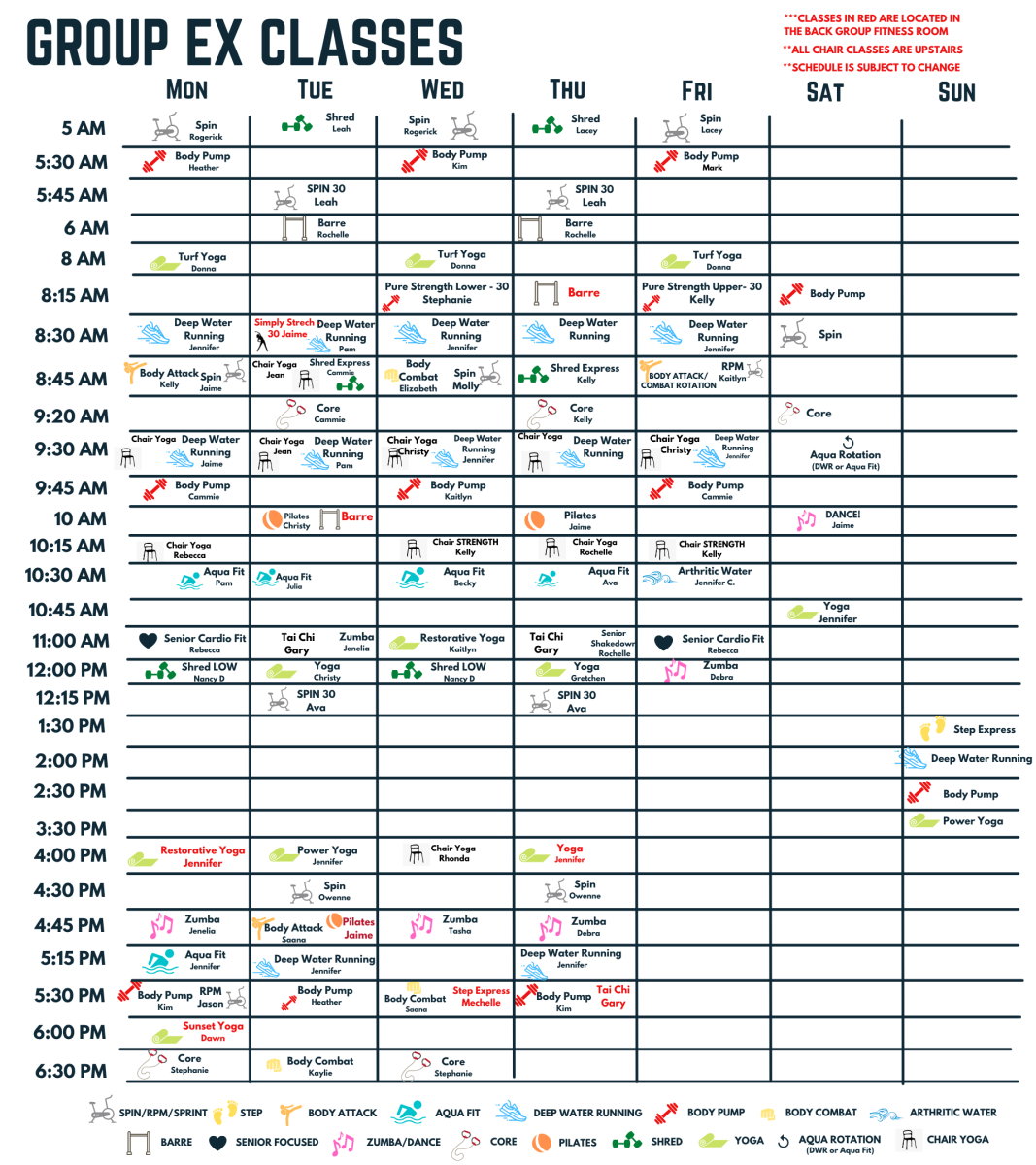Members of all fitness levels can benefit from this fun, high-intensity cardiovascular aqua workout in a virtually stress-free environment. This is the perfect class for those who love aerobics but need low-impact. (45 minutes) * all fitness levels, great for beginners or those recovering from injury |