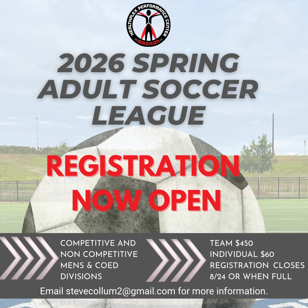 - Registration for the 2026 Spring Adult Soccer League is now OPEN!! We will offer leagues for Competitive and Non-Competitive Men's and Coed divisions. The cost per team is $450.00. We will also accept Individual registrations for players looking for a team to play on. The cost for Individuals is $60.00.